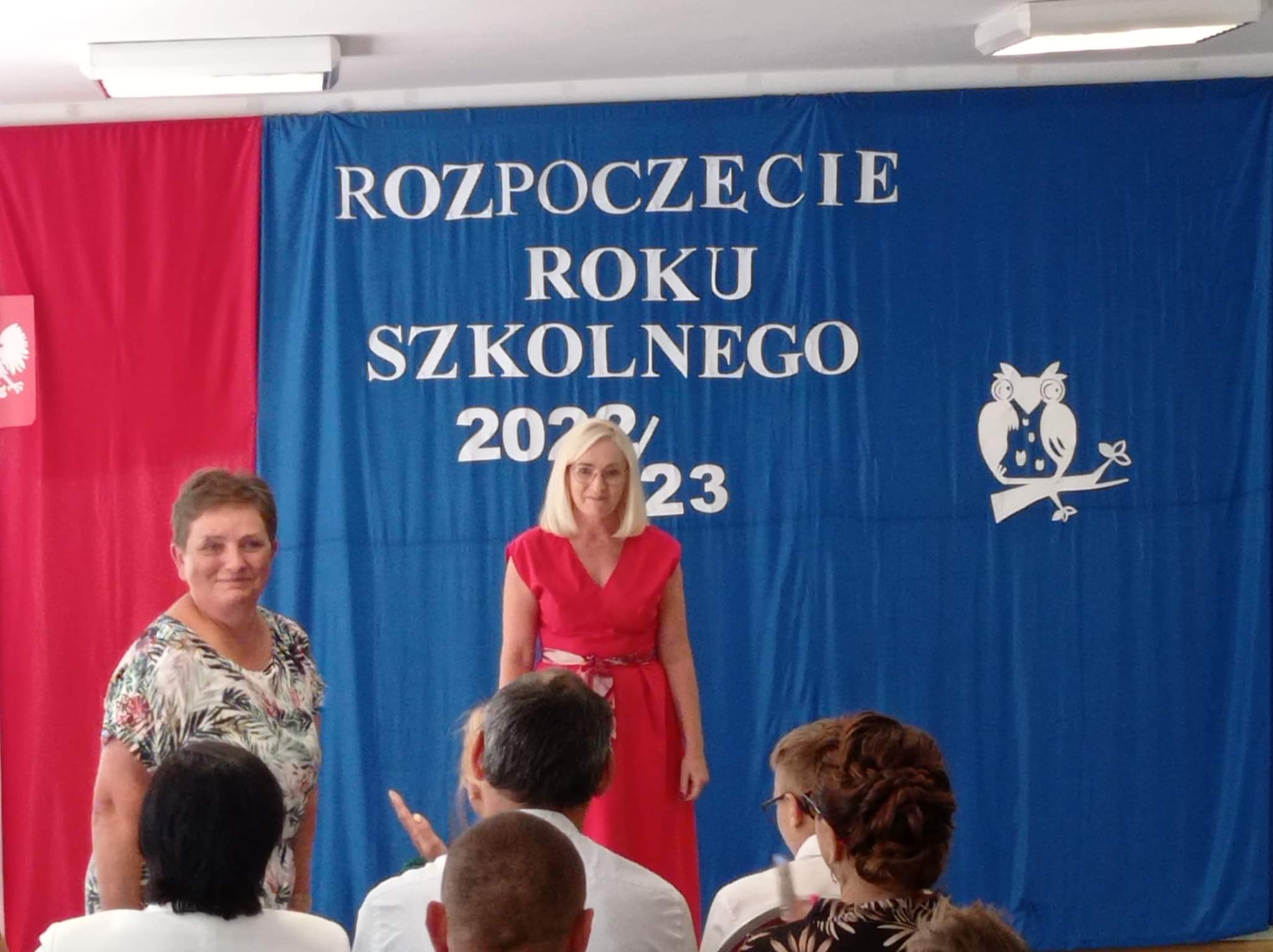 Następnie minutą ciszy uczczono ofiary II wojny światowej. Później p. Dyrektor ciepło powitała zebranych, a zwłaszcza uczniów rozpoczynających naukę w naszej placówce oraz przedstawiła nowych pracowników.