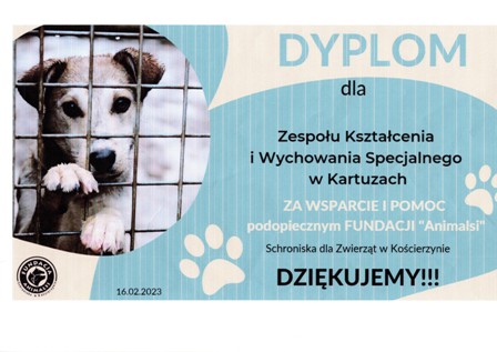 Dary dla schroniska w Kościerzynie Szczegóły Kategoria: Aktualności Utworzono: 13.05.2023 16 lutego 2023r. w ZKiWS została przeprowadzona zbiórka darów na potrzeby schroniska dla zwierząt. Zebrano m.in. koce, karmę i pieniądze, które zostały przekazane do Schroniska dla Zwierząt "Animalsi" w Kościerzynie. Zawodowa zgaduj zgadula - warsztaty Światowy Dzień Walki z Depresją