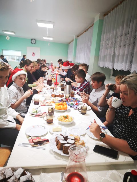 o miłości, wybaczeniu i pojednaniu. Składając życzenia wprowadziła wszystkich obecnych w klimat magicznych Świąt Bożego Narodzenia. Był to wieczór pełen wzruszeń i pozytywnych emocji. Wszyscy odświętnie ubrani, przy dźwiękach kolęd, zasiedli do pięknie udekorowanego stołu. Na stole wigilijnym znajdowały się tradycyjne potrawy: barszcz czerwony, smażone ryby, kapusta z grzybami, ciasta i wiele innych smakowitych dań. Magia tego wyjątkowego wieczoru zbliżyła do siebie jeszcze bardziej wychowanków i wychowawców. Niech ten radosny nastrój wychowankowie zaniosą do swoich rodzin i domów.