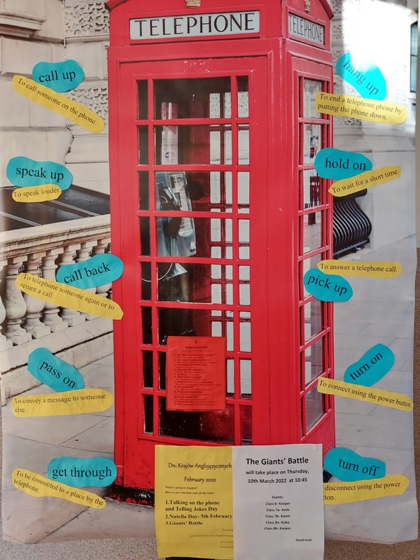W dniach 3 - 11.02.2022 r. odbyły się coroczne Dni krajów anglojęzycznych, w czasie których uczniowie przygotowywali dialogi - rozmowy telefoniczne oraz odbył się konkurs „The Giants’ battle”, pojedynek gigantów dla najlepszych uczniów z klas 6 - 8.