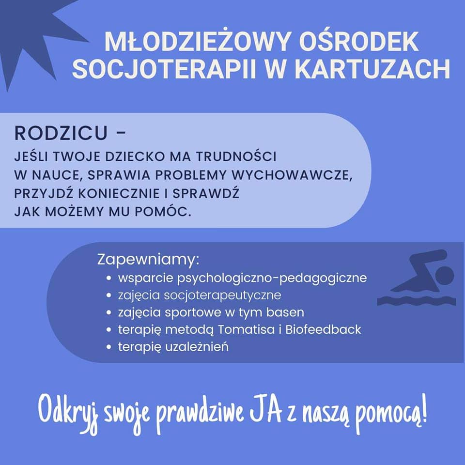Młodzieżowy Ośrodek Socjoterapii jest przeznaczony dla dzieci i młodzieży, które z powodu zaburzeń rozwojowych, trudności w nauce oraz zaburzeń w funkcjonowaniu społecznym są zagrożone niedostosowaniem społecznym i wymagają stosowania specjalnych metod pracy, wychowania i socjoterapii. Do zadań MOS należy eliminowanie przyczyn i przejawów zaburzeń zachowania oraz przygotowanie wychowanków do życia zgodnego z obowiązującymi normami społecznymi i prawnymi. Nabór do MOS odbywa się na wniosek rodziców lub opiekunów prawnych dzieci posiadających orzeczenie Poradni Psychologiczno-Pedagogicznej o potrzebie kształcenia specjalnego.