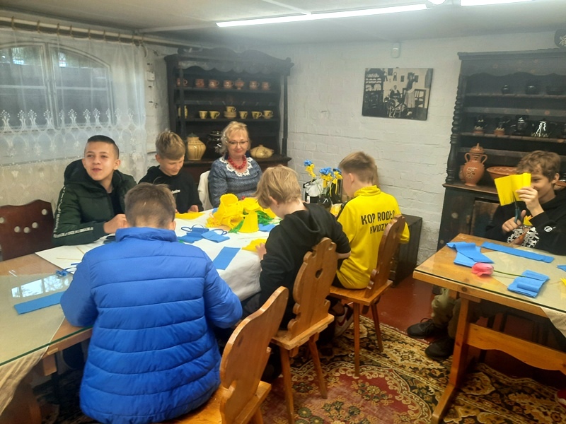 Chłopcy mieli okazję zobaczyć wystawę zabytkowych aut, eksponaty związane z kulturą naszego regionu oraz wykonać symboliczne kwiaty w geście solidarności z walczącą Ukrainą.
