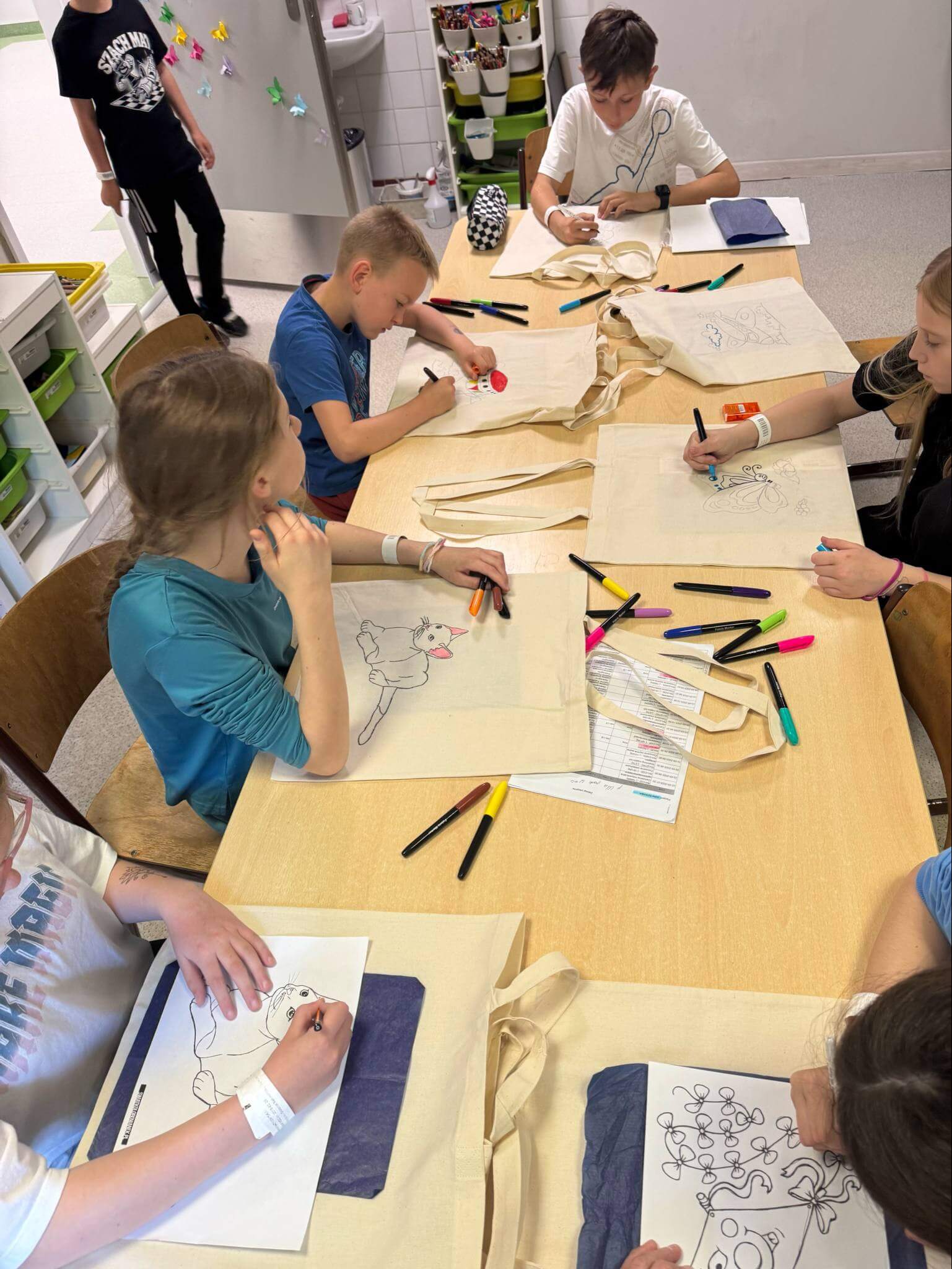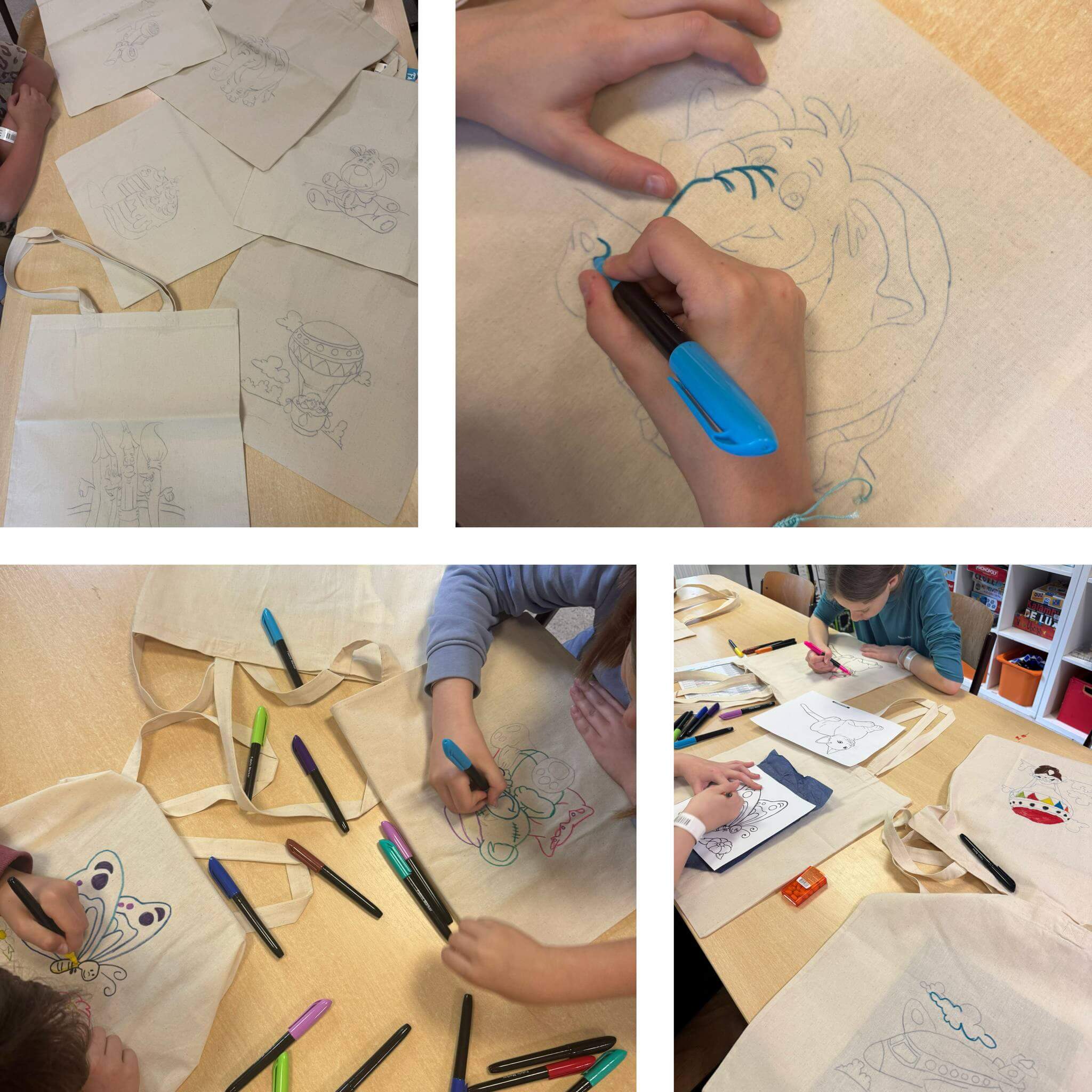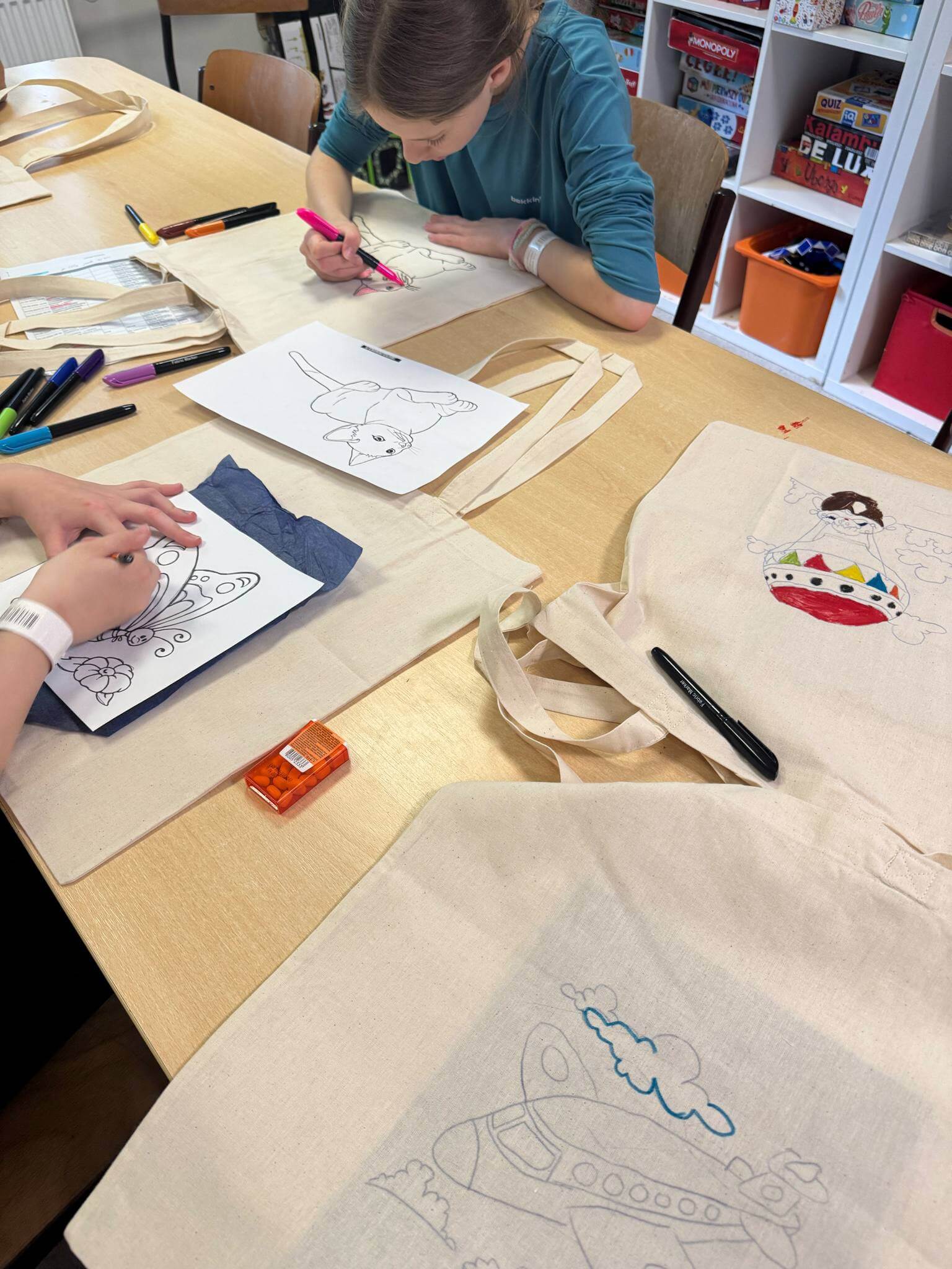 29 maja 2025 r. dzieci przebywające na rehabilitacji od rana, na świetlicy szkolnej, przygotowują wyjątkowe prezenty na Dzień Dziecka – własnoręcznie ozdabiane torby materiałowe. Za pomocą specjalnych mazaków do tkanin tworzą kolorowe, niepowtarzalne wzory, wkładając w swoje prace mnóstwo serca, radości i kreatywności. To nie tylko świetna zabawa, ale też forma terapii rozwijająca sprawność manualną i wyobraźnię.